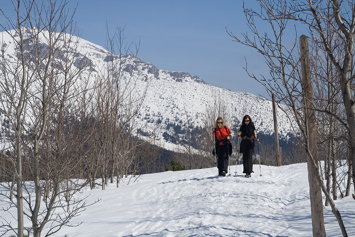 Baby kazały się zaprowadzić gdzieś, gdzie będzie miło, łatwo, pięknie i żeby się nie spociły, a u celu można się napić wina 😀 No to wyjazd o zabójczej 7:30 z Krakowa, jedziemy kosMito, z kierowniczką, więc też nie za szybko i o 10.00 parkujemy na parkingu T.L. Biela Voda. Pierwsze zdziwienie, wszędzie na Słowacji parkingi darmowe, ale tutaj, opłata 5? 🙂 Wychodzimy na szlak, z początku nawet nie ma śniegu, cieszę się, że wziąłem letnie spodnie, z których mogę odpiąć nogawki 🙂